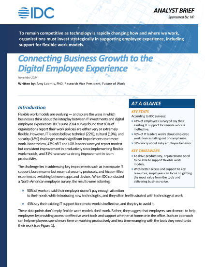 IDC’s June 2024 survey found 83% of organizations report very or extremely flexible work policies. IT leaders cite technical (22%), cultural (19%), and security (18%) challenges as key remote work impediments. Still, 43% of IT and LOB leaders see modest productivity gains, and 31% report strong improvements. Challenges include inadequate IT support, complex security protocols, and friction switching apps. A North American employee survey showed 50% feel employers don’t consider their needs with new tech, and 43% find IT support ineffective. These findings don’t mean flexible work fails, but employers must provide better tools and support to help employees focus on productive work.