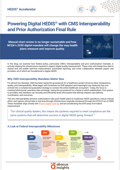 In this blog, we examine how federal policy, particularly CMS’s interoperability and prior authorization mandate, is actively shaping the infrastructure required to support digital quality measurement. These rules will change how data is shared and will enable real-time measurement, automated reporting, and richer collaboration between payers and providers, all of which are foundational to digital HEDIS.
